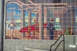 Using hand glazed and fired tiles, the colorful images in "Poet's Table" present a panorama of Huntington Beach history and geography as seen through a poet's imagination. Schoonhoven located cultural references in his research and placed them according to specific time periods. For example, on January 18, 1988, a winter storm hit the California coast ripping the portions of the Huntington Beach Pier from their pilings and destroying a large section of the structure. Replicating the original 1914 framework, a new pier was built using reinforced steel, coated with epoxy, to protect it from the corrosive effect of the damp salt air. At 1856 feet long, the new pier is 13 feet higher and 20 feet longer than it's predecessor. Schoonhoven pays homage to the previous pier by including images of its pilings in the mural.