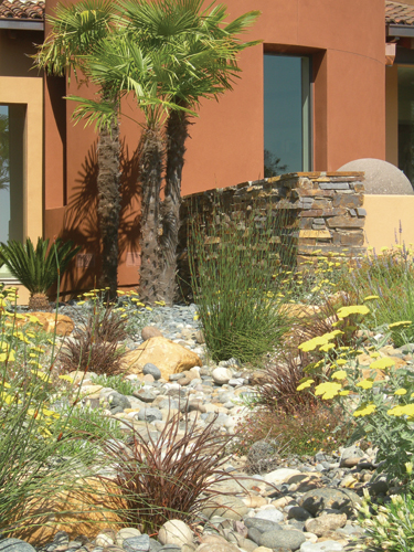 Besides integrating native plants, Madrone was also commissioned to integrate 12 striking pieces of contemporary art around the property. Rick Mathews and his wife Loren, as well as foreman and irrigation specialist Efren Castro designed the project. They also brought in stone specialist Higinio Benetiz. ''Over the years our main niche has been that of a sustainable landscape company. We are known for our company involvement, for taking our relationships with our clients seriously,'' declared Mathews. ''This design was a collaboration that started with the homeowner's vision. We were working from a vague conceptual sketch, but all the planting material was chosen in collaboration with the owners.''