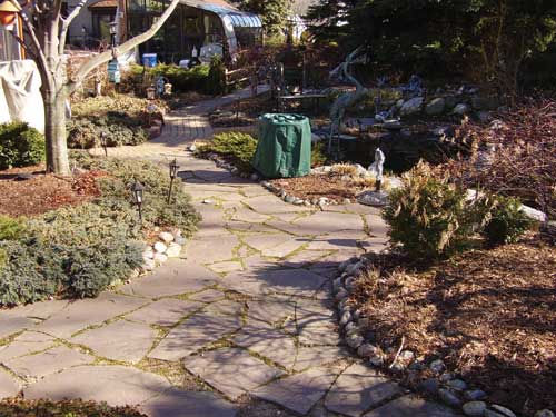 Walkways Workers laid a 2-inch flexible PVC pipe under the middle of the patio and across one of the walkways to the water garden’s 8,800 GPH centrifugal pump. Next, a 1-inch leveling course of crushed pea stone was screeded over the entire area and then they installed Atlas Hardscapes Harbour Stone.