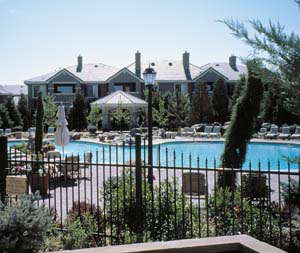 Through the entry, the leasing office area is lined with more petunias in an abundance of color until you enter the pool area's lagoon style setting. Here, a bit more exotic plant selection was wanted. Stephen Giossi, who heads up the retail nursery was instrumental in selecting the correct type of plant material for this selection. Pots full of annual color, Variegated Canna lilies and lace leaf Japanese maples surround the pool area. Four 10-foot Sequoiadendron "pendulum" accentuate the rocked areas close to the spa, which are surrounded by ornamental strawberry ground cover with a backdrop of blue atlas cedars and Blue Spruces, all of which thrive in this region under the water restrictions imposed on Tanamera.