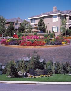 Because of the soil type and the drastic temperature variations in the seasons, plant selection at the job site was key. At the entry to Tanamera, Quacking Aspens, Giant Sequoias and Austrian pines stand scattered on the open knoll of turf. At the forefront of the knoll are two rockscape water falls with the Tanamera sign overhead. Surrounding the waterfalls are an assortment of perennials such as Gaillardia, Shasta daisies and Chrysanthemum. As you drove down a brick-paved driveway, arborvitaes, photinas, red twig dogwoods and all types of brooms line the winding path until you hit its centerpiece fountain filled with petunias, marigolds and chrysanthemum.