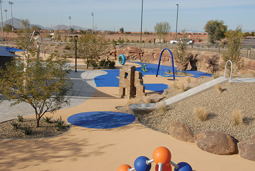 Outside the Lines "Typically, the landscaping goes on concurrently with the playground installation," admits Stafford. So cooperation is very important. ValleyCrest was contracted to install almost all of the landscape and irrigation in the park and knew this to be true. According to Kristi Staley, the company's marketing communications manager, the project, "required tight coordination with lake construction, concrete construction, and playground installation in order to meet the completion schedule, which was fixed due to the start of spring training." Turf and trees are blended with xeriscaped areas throughout the park. Most of the turf is paspalum that was installed by hydroseeding. However smaller areas within the playground were sodded with paspalum after the playground was finished. But due to how late in the year it was by then, those areas had to be over-seeded with rye. The irrigation system for the turf relies on Hunter sprinklers and Rainbird controllers. The xeriscaped areas contain bushes such as oleander, cordia, red fairy dusters, jojoba, sage, and honeysuckle; various trees including acacia, olive, ash, elm, oak, and mesquite; and for mulch, 3/4-inch brown decomposed granite. These planters are irrigated with Rainbird drip emitters. Other tree varieties around the park are ironwood, blue Palo Verde, Medjool date palm, purple-leaf plum and Bradford pear. Any tree planted within 10 feet of a hardscaped area had a root barrier installed. Bougainvillea, bottlebrush, hibiscus and rosemary are among the other bushes. Accents include agave, desert milkweed, aloe, deer grass and yucca. ValleyCrest reported that it took 35 people seven months to complete this widely diverse, impressive landscape that is being maintained by city crews. The work of these two landscape contracting companies, together with the efforts of the rest of the team that resulted in a 1,000-square-foot splash pad, a 5-acre lake, a 50-foot-tall pyramid net climber, a 10,000-square-foot, S-shaped ropes course, and a 300-foot-long climbing wall among other attractions, delivered a crown to the city of Mesa.