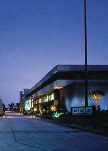 "The metal halide floodlights have a blueish cast to them, while the incandescent spotlights were used as a contrasting color of light used at points of entry," Brogden said. "Fluorescent striplights were used in creative ways in interior circulation areas. Additional metal halide spotlights were used to light trees and other landscape elements."
