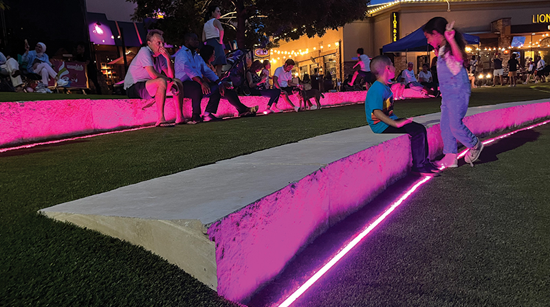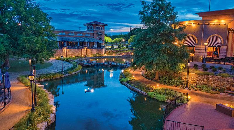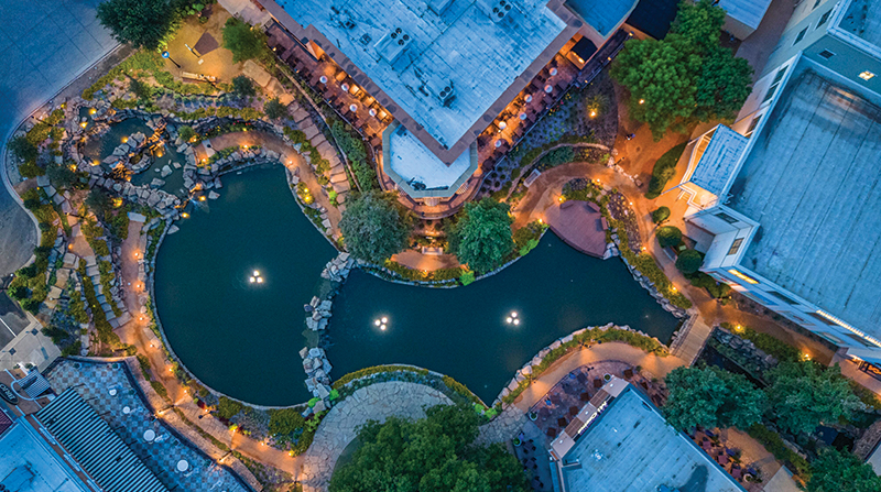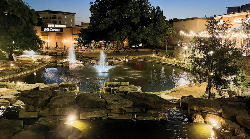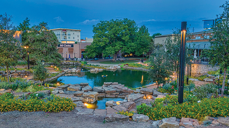 Watters Creek at Montgomery Farm in the Dallas/Fort Worth metroplex is a vertically dense, 52-acre site that became known in 2008 as a distinctive mixed-use development, but over a decade later, it needed some polish to regain its shine. Charter Holdings added the site to their portfolio of high-end properties in 2022 and called on Dallas-based landscape design-build-maintenance firm Complete Landsculpture to refashion the surrounding outdoor environment to attract more exclusive tenants. A guiding concept shaped by the new owner was to transform Watters Creek into the "Knox Street of the North" - a reference to a nearby shopping and dining destination that has been heralded as one of the area's "most luxurious and bustling urban enclaves" and "most strategically important retail corridors."Scope and Size Lead designer and project manager Santosh George, ASLA, explains, "The existing framework was there - the pond and creek, some of the walks, the village green - but it was all in an unmaintained condition when we started." So, George's team was tasked with modernizing the approximately five-acre landscape that fronted all built forms while maintaining the prevailing infrastructure for cost efficiency. Modifications included the addition of three separate fountains in the pond; a composite deck overlook with custom wooden benches; the relocation of an iconic sculpture from the central lawn, which was replaced by a tiered seating event space; a sustainable, Texas-themed planting theme emphasizing native plants; and Instagram-worthy landscape lighting installed throughout the site. Playing a pivotal role in the project, the landscape team worked closely with the new ownership and facility management company DuWest Realty to align their share of the site's renovation with the overarching project goals - and do so without interrupting the daily comings and goings of visitors and occupants. Design ProgramIn shaping the design for the landscape makeover, it was crucial to understand the inimitable role that Watters Creek Village - as it is also known - had in the community as an asset to shoppers, workers, and residents. So, too, was the disclosure of challenges such as freeway noise, high sun exposure, and gusty wind due to a wind tunnel effect.