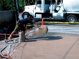 Morgan said cleanup should be done the day concrete is poured with water and a scrub brush. The textured concrete should be pressure washed three to five days after installation. Morgan recommends that a minimum 2,000 psi pressure washer be used. Touch-up, chip repair and acrylic exterior concrete sealing finishes the job.