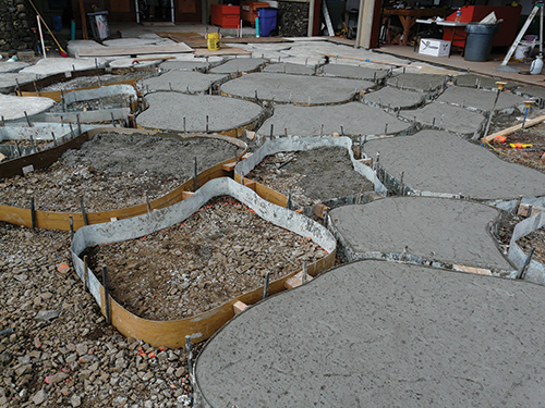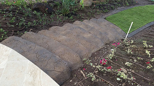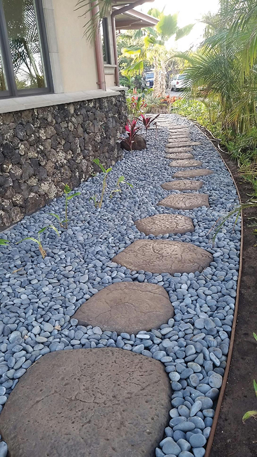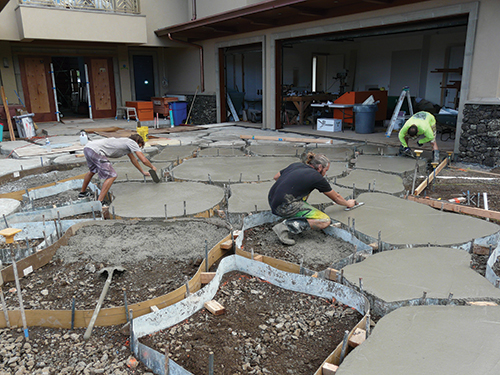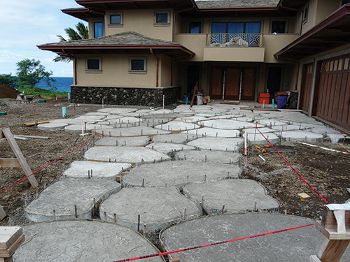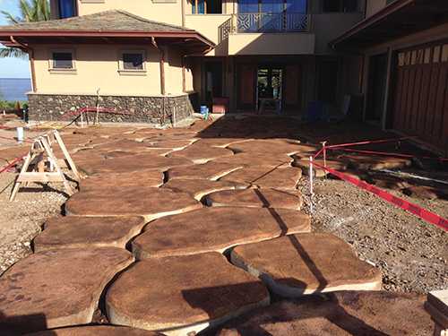 RockMolds.com of Boise, Idaho manufactures and distributes tools for textured concrete applications. They specialize in stamps that give concrete the look of Hawaiian stone. Recently they were asked to lend their expertise to a project on the island of Maui. At a home being built in the town of Makena, the general contractor Haven International chose RockMolds LLC, the installation division of RockMolds.com, to create the driveway, a stepping-stones path and a set of stairs. Masons Creations Maui, a local contractor, was also enlisted to help. David Schwartz, the founder and president of RockMolds, takes us step by step through the construction of the driveway.