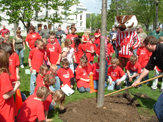 Students, teachers, parents, officials from the Wisconsin DNR, politicians, and Green industry professionals were on hand at the Capitol in Madison for the Arbor Day Celebration. The events included greetings from Genny Fannucchi, Dick Rideout, and Secretary Matthew J. Frank of the DNR, Representative Mark Honadel, Kathy Swingen of The Bruce Company, Chief State Forester Paul DeLong, and Author Sheila Terman Cohen. Bucky Badger and Smokey Bear made appearances, too.