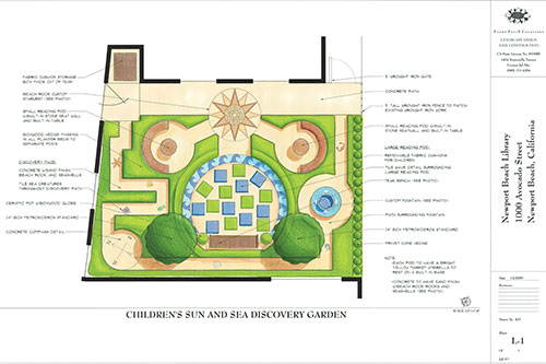 Fenmore envisioned the garden differently from her fellow designers when she entered a Design Challenge sponsored by the Friends of the Newport Beach Public Library. Fenmore designed the venue as a ''discovery'' site for youngsters and wove in a nautical theme. She created a plan with group and individual seating pods, a water feature, boxwood maze, winding seashore-themed path and anchor-point mosaics.