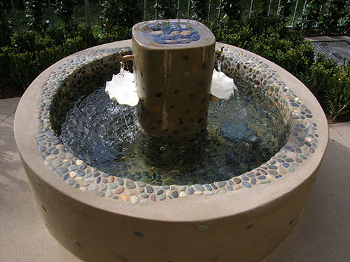 Vertical surfaces, seat walls and seating areas were faced with Cameron Ledge stone in a ''dry stack.'' The on-site construction, which included hand-detailed mosaic work, took six workers one month to complete. Fenmore designed the solid concrete fountain, which is detailed with smooth beach pebble inlays, as well as a seashell ledge.