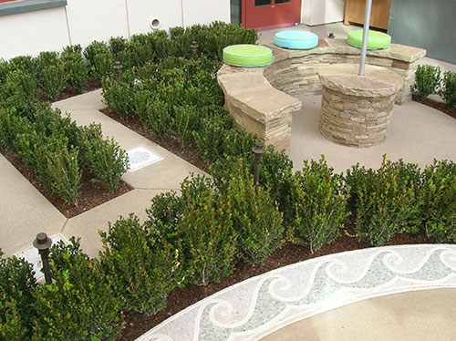 The hand-laid sunburst pattern in the hardscape also features smooth beach pebbles while a sea-blue mosaic of rolling waves circles the story time pod. A directional compass points out North, South, East and West. Hand-painted ocean-themed tiles are placed along the maze walkway. The tiles were designed by Fenmore and fabricated by Concept Studios of Corona del Mar, California.