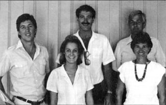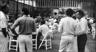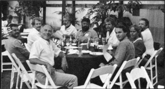 When we stopped in at the SCC/ASLA Conference we ran into George and Connie Bacerra and were lucky to share lunch with (from left to right): Mike Cucchiara (Hydro-Scape Products, El Toro); Kim Shield (our own circulation supervisor); Larry Mackler (also with Hydro-Scape Products); and John and Betty A dink of the Nebraska Based A -G Sod Farms (who are adding Southern California to their list of growing fields).