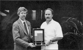 Charles de Garmo (right) of Landform Industries holds a plaque honoring him and Gregg Applegate of Pacific Coast Nursery for their efforts in the CLASS Fund Membership Drive.