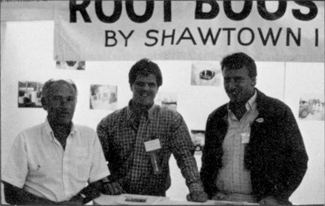 While at the SCTGC Turf Show Bob Stover (left) pauses with Howard Schau (pronounced Shaw) and Al Mattson from Shawtown Industries to discuss how the new Root Booster root guard protects sidewalks.