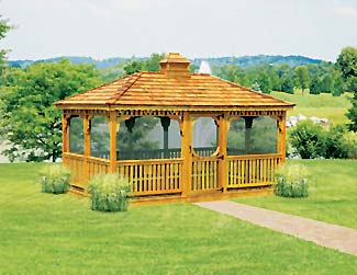 Pressure-treated pine also makes a sturdy, long-lasting gazebo because it is highly resistant to decay and insect damage. A kiln-drying process, before and after pressure treatment, minimizes warping, checking, and twisting. As with all wood gazebos, a stain/sealer should be applied to the entire structure, including the floor and the roof, once a year, to protect it from the elements.