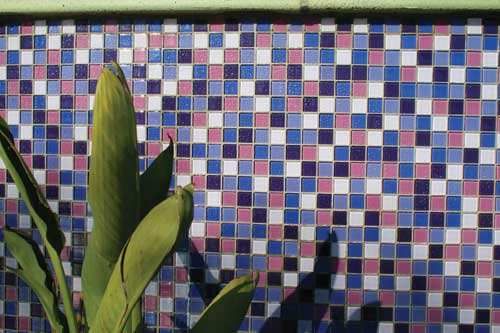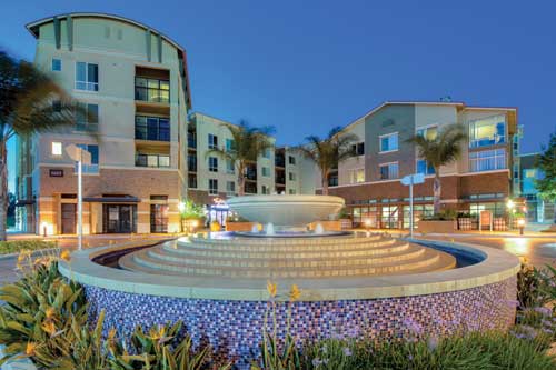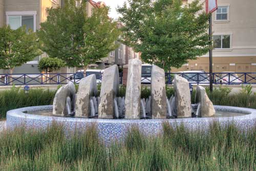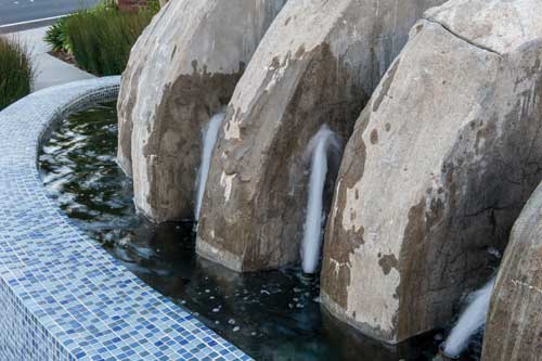 At the entry to the Recreation Center is a fountain of stacked sandstone for a waterfalls effect, boulders and artist crafted painted tiles. The boulders appear to float at night, an effect created by uplighting them below with 110-volt, 250-watt brass submersible lights. The glass tiles for the development?EUR??,,????'???s five fountains were chosen to give individual character to each one, but also, the landscape architect notes, for their chemical resistance and the ability to fit upon odd concrete forms, such as circular and oval basins.