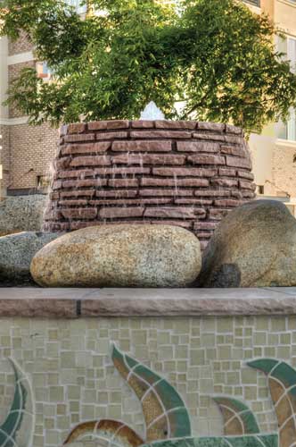 Sandstone Fountain At the entry to the Recreation Center is a concept fountain of uplit boulders, stacked sandstone and custom glass tiles that engages visitors as they drive through and arrive at the core of the village. The elevated sandstone raises the water level, which enhances additional water movement at a greater visible distance possible than with just a small basin and low jets.