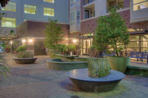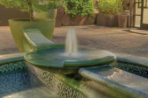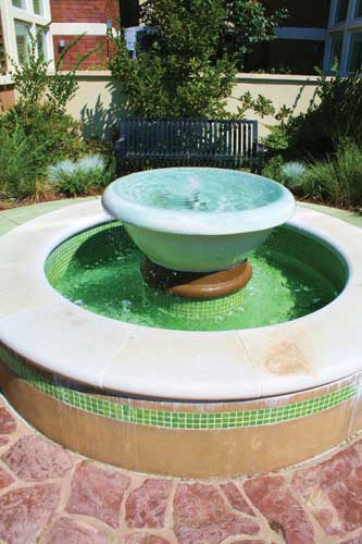 Within an enclosed courtyard sits a custom concrete fountain, bowl and planters fabricated by Quick Crete from the designs of the landscape architects. The fountain is on a 10-inch thick structural concrete slab, with a basin decorated inside and out with gray glass mosaic tiles.
