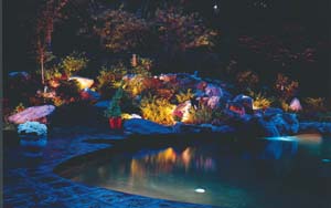 Out of the darkness come the natural sounds and tranquil splashes of a stream delicately spilling over the crest of a precisely designed and sculpted fall. The waters rhythmic song fills the evening air in a chorus of relaxation. Professionally designed and installed water features present the residential client several opportunities to realize further enjoyment from their home and landscape. Unfortunately, the ambient sounds described are the only possible evening benefit a homeowner can derive from a water feature that is not properly lit.