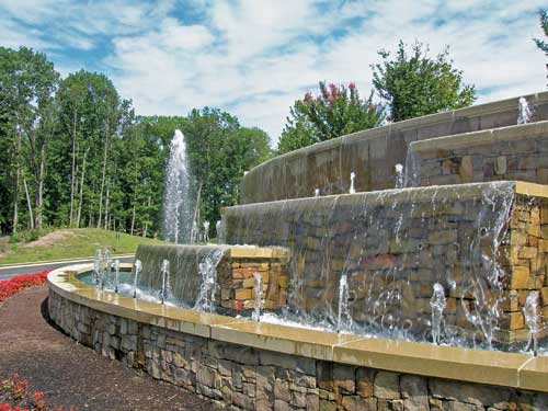 An 8-foot wide by 9-feet tall by 14-feet long direct-bury fiberglass enclosure behind the fountain houses a 15 horsepower pump for the waterfall, a one horsepower pump and two 3/4 horsepower display pumps for the nozzles. The enclosure also has a filter pump, cartridge filter and control panel. Excavation for placement of the vault required temporary shoring from the parking lot and building pad. An anemometer is located on a nearby light pole to reduce the height of the spray or shut down the nozzles in the event of high winds. __________ Higgins & Gerstenmaier, PLC is a landscape architecture and land planning firm in Richmond, Virginia. Keith Van Inwegen was the fountain designer and managed the project through construction, and Dave Gerstenmaier served as principal in charge. Design Team Owner: Reynolds Development, Lingerfelt Development Tenant: Bon Secours Richmond Health System Landscape Architect/Fountain Designer: Higgins & Gerstenmaier, PLC, Henrico, Va. Architect: Odell Associates, Inc. Structural Engineer: Draper Aden Associates Civil Engineer: RK&K General Contractor: Hourigan Construction Vendors Arch. Precast Concrete: Seaboard Concrete Concrete: Heard Concrete Electrical: Commercial Electric Fountain equipment: Roman Fountains Plumbing: Atlantic Constructors Site contractor: Shelton Corporation