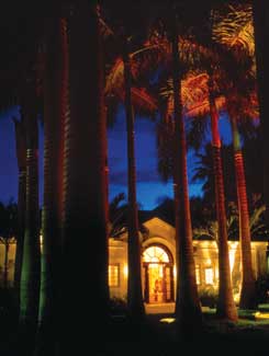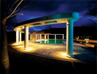 This is the most naturalistic way of lighting an exterior space. The effect is as if the area were being illuminated by a full moon. A dappled pattern of light and shadow is created along pathways and over low-level plantings. This is accomplished by mounting luminaires in mature trees, some pointed down to create the patterned effect and some pointed up to highlight the foliage canopy.