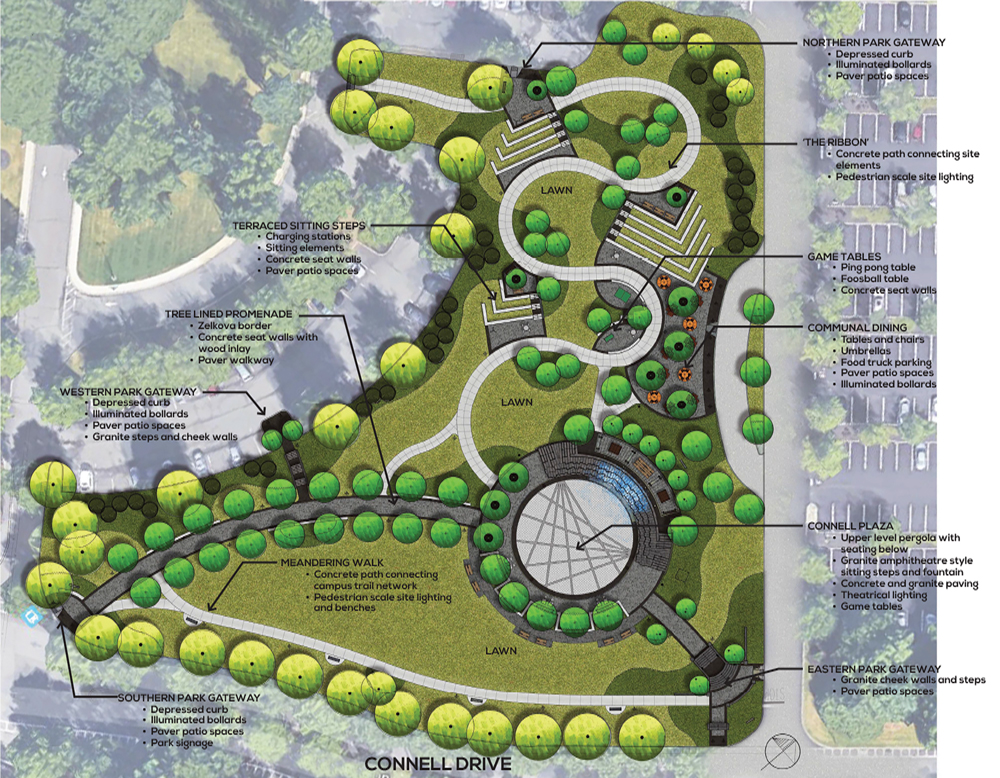 The Connell Real Estate and Development Company had an idea to transform Connell Center Corporate Park in Berkeley Heights, N.J., into a pedestrian-friendly campus with multiple recreational experiences and environments. Connell Center was expanding. A new hotel was in the works, and there were plans for residential development to create an active mixed-use campus. Melillo + Bauer Associates, Inc. Landscape Architecture was retained to create a dramatic vision for a multifunctional park space that would form the nexus of pedestrian circulation. The Grove was envisioned as a place that would offer outdoor workspaces and social and event spaces to address the modern workforce and new mixed-use nature of Connell Center.