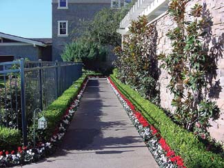 Native plants are primarily used throughout the grounds. Thompson uses a variety of plants in every season. The larger plants are canary palms, New Zealand Christmas trees and Washingtonia palms and bougainvillea. Aloe, Mexican sage, marigolds, pansies, birds of paradise, rosemary and cyclamen (for winter color) are some of the smaller varieties used throughout the grounds.