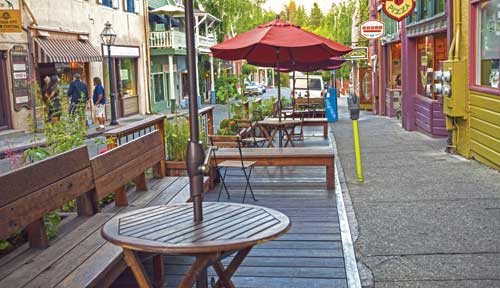 It's not all roses, however. Whether or not the boardwalk should stay has become a great source of contention among the local population. The location of the boardwalk was chosen because it was considered a "troubled spot." Merchants there had struggled because the area was unattractive or even scary to locals and tourists. For some groups of young adults the spot was a hangout. As there was no place to sit, they would frequently sit right on the sidewalk, blocking the way with their legs, backpacks or their dogs. It was intimidating. Inspired by San Francisco's Pavement to Parks program, the boardwalk on Commercial Street was championed by the Nevada City Sustainability Team with the support of community volunteers, businesses, the city and its staff. Today it is the venue for live music every Thursday afternoon. It's a place where people meet to have a cup of coffee or a slice of pizza, then walk around town. A group of teens meets there to knit. The young adults who used to hang out on the sidewalk are also there. Some feel the boardwalk encourages these young people to gather there, and that it should go. Might one take a different stance? The sidewalk is no longer congested, and there is beauty instead of parked cars. There is space for everyone.
