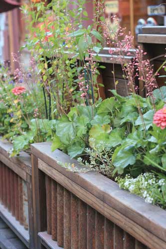 Gary Tintle of Tintle, Inc., directed construction of the boardwalk. For weeks prior to the installation, volunteers converged on Tintle's workshop to construct the modules that would make up the boardwalk, while Tintle and Kaufman, both members of the Nevada City Sustainability Team, worked out the design details. Community members from the mayor to kindergarten students came out to help. Installation of the boardwalk took one morning, and people immediately began to enjoy their new sitting area in a town lacking public gathering spaces. As part of the approval of the project, the Nevada City Sustainability Team had to figure out how to maintain the boardwalk with nominal expense to the city. The three parking meters left in place after construction of the boardwalk are now brightly colored "Give-O-Meters." All money donated to the meters goes into a fund for the maintenance of the boardwalk. So far, enough money has been raised to cover the costs of upkeep, which includes wood stain, new plants, mulch, fertilizer and potting soil.Originally planted exclusively with California natives donated by Floral Native Nursery of Chico, Calif., the boardwalk has been under the care of former mayor Reinette Senum, local residents and merchants. If plants die, or where they haven't filled in quickly enough, these caretakers put in new plantings, which seems to work fine. In winter, annuals such as pansies and snapdragons bring color; in spring, bulbs emerge and bloom; in summer, sunflowers tower above all else, inciting passers-by to smile.