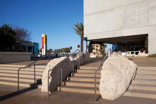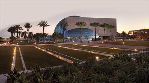 The four basic elements of the site design are the entry and grotto experience, the gardens, the materials and the ?EUR??,,????'?????<?Discovery Moments.?EUR??,,????'?????<? GBLA Landscape architects Phil Graham and Hunter Booth, designed the grounds with a coastal casual theme, replete with colorful and flowering shrubs, palms and trees that reflect the coastal character of Spain and practical for Florida?EUR??,,????'?????<???EUR?s subtropical climate. Twelve-hundred tons of Florida limestone boulders, some the size of a Volkswagen bug, were placed throughout the site to create a five-foot change in elevation suggestive of Dali?EUR??,,????'?????<???EUR?s Catalonian home. This rocky coast, or Costa Bravo, is ubiquitous in his landscape paintings. The rocks were meticulously placed, and not stacked around the site, for a more Daliesque feeling. Some rocks were wire cut into benches while others form pockets for sliding gates. A feature rock was split and arranged on the inside and outside portions of the enigma glass structure, simulating the glass was built around the rock.