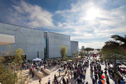 The Gardens The landscaped area on the western face of the museum displays colorful, heavy-textured plant materials interspersed within the large natural boulders. The western face of the museum structure will be partially covered with creeping fig vine up the vertical face of the building. As the fig vine races upward to vegetate the 50-ft. building, it will be a striking contrast to the stark concrete of the building.