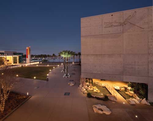 Connecting the Salvador Dal?? Museum and neighboring entertainment center, the Mahaffey Theater, is a spaceGraham-Booth Landscape Architecture collaborated on with architect Robert Aude to link the visual and performing arts. A generous open green space, manicured terraces and a bosque of mature crape myrtle trees offer space for patrons of both venues to gather. Sleek, contemporary site furnishings, accent lighting and Tivoli lights in the trees make this area a dramatic setting for night performances and civic gatherings.