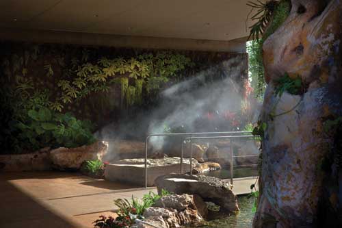 The Entry and Grotto The museum entry provides an enchanting foretaste to the surreal world of Dali. Visitors pass through stairs with massive, sliced boulders and cross over a floating walkway/bridge level with a small pond, into a jungle of tropical foliage. They experience a vertical green ?EUR??,,????'?????<?living?EUR??,,????'?????<? wall delicately damp from a fine misting system. Varieties of ferns, bromeliads, orchids and philodendrons provide stunning contrast to the stark concrete forms. The wall was formed with a ?EUR??,,????'?????<?Green Screen?EUR??,,????'?????<? product caged trellis system attached to the wall and is 35?EUR??,,????'?????<???EUR? long and 8?EUR??,,????'?????<???EUR? tall. Voids in the trellis were filled with sphagnum moss and plants knitted into the structure. The arrangements of the plants simulate jets of water jutting across the canvas of the trellis at varying angles.