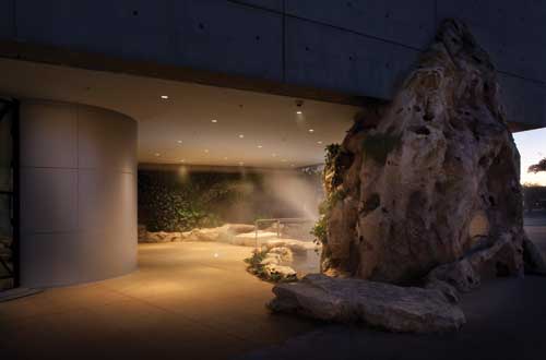 A 20-ft. tall man-made boulder supports one corner of the massive cubistic building with natural stone benches in the area. This iconic boulder, themed by the Valley Crest Landscape Development team (Tampa branch), as well as the living wall, has plants in pockets and flowing water that weeps out of crags and crannies. A misting system is integrated to give the whole area a mysterious and cooling effect before visitors enter the museum while helping to irrigate the plants. Showcased on the north side of the rock is a small historic fountain, celebrating the Fountain of Youth, which also appears in Dali?EUR??,,????'?????<???EUR?s artwork and sought by the explorer Ponce de Leon.