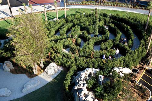 Children delight in a winding labyrinth with seven-foot tall walls of solid podocarpus shrubs. Modeled after a labyrinth at Chartres Cathedral in France, parents enjoy listening to their children run and play through the labyrinth or joining in the fun themselves.