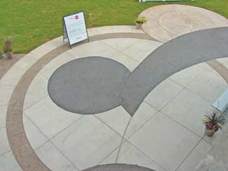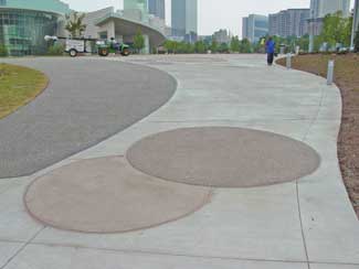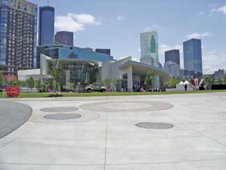 There is a fair amount of turf in the central area, which was intentionally left as open space to include a wide range of activities such as concerts or corporate events. The central ellipse on the site has a wide pedestrian walkway around it that can accommodate heavy truck traffic for some of those events. The ellipse is split in the middle by a red brick walkway, which represents the Dynamic Ribbon logo. That is one of the more literal icons incorporated into the design.