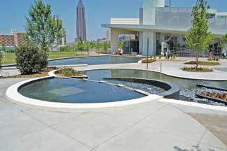 One of the main site elements is a Water Story Garden which wasn’t in the original master plan. Because of Coca Cola’s concern about water as an important global resource and their interest in promoting water as an important element in the world, they decided to make the water garden an important site feature. The story behind it is intentionally implicit. It is the abstract expression of the many ways that we encounter water around the globe. There are springs, waterfalls, babbling brooks, lakes and rivers, all as part of the design. The Water Story Garden is the central area between the Aquarium entry and the New World of Coca Cola entry, and is the more highly developed and designed part of the site.