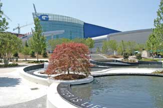 Another challenge was the elevation changes in the Water Story Garden area. Part of what needed to be accomplished was a transition between the Aquarium and the Coca Cola attraction. The Aquarium is situated about ten feet higher, so they took advantage of the grade change as part of the water feature while incorporating pedestrian movement with meandering paths through the garden. Sets of terraces radiate off the atrium hub and those are separated with seat walls that step up. The terraces themselves are also more intensely developed as a garden. This facility gets a lot of use for private events—not just corporate events. Atlanta has a huge convention business and the Convention Center is also located downtown. Therefore, the site is used for other corporate events as well. The slopes above the terraces are planted with annuals and perennials as part of those garden spaces.
