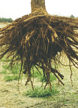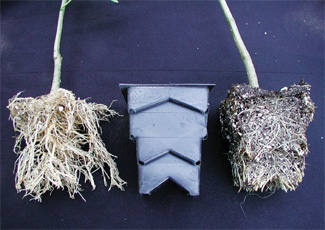 When air-root pruning is accomplished at the proper time and depth, secondary roots originate positioned horizontal or slightly downward. The challenge has been to find a way to keep these roots growing horizontally. In bottomless milk cartons, plastic tubes or sleeves, and open bottom plug trays, there is no opportunity to maintain horizontal root growth. These types of containers deflect all secondary branch roots down, leaving few, if any, roots to grow horizontal following transplanting. Trees grown in plug or milk carton type containers and planted into larger containers promptly develop a complex mat of roots at the bottom and modest roots above (Figure 5). Similarly, when trees grown in plugs or milk carton type containers are planted in the field, most roots extend downward, further reducing the amount of roots in the root ball when harvested balled-in-burlap or with tree spades.