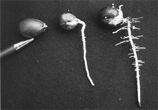 When a seed germinates in the wild, a strong primary or taproot plunges downward. The tip of the taproot has a strong dominance that suppresses secondary root branching in the same manner as the tip of a new shoot suppresses production of side branches. The objective of the taproot in the wild is to extend deeply to anchor the new plant and access moisture to avoid dehydration. The objective of the new shoot is to reach sufficient vertical height to access light to support leaf functions and to avoid being overshadowed by competing vegetation. A typical tree seedling top response is to develop few, if any, side branches until the leaves on the main stem are positioned in sunlight. Likewise, a typical response with the taproot is to produce few, if any, branch roots until the taproot has extended considerable distance, often three feet or more, and provisions for the plant have been secured. Since there are limited energy resources stored in the seed, the young plant proceeds most efficiently. Only after the taproot is secured and is providing water and nutrients and the new leaves are producing energy does appreciable secondary branching begin to occur both above and below ground.