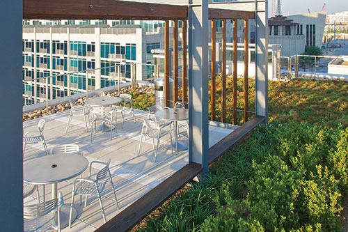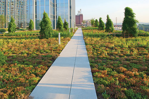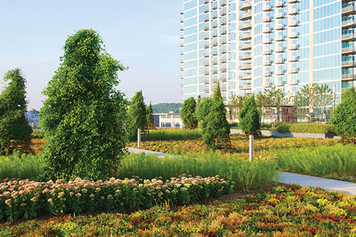 The project scope included the landscape and irrigation installation for the building's streetscape and rooftop garden Piedmont installed 35 trees, more than 33,000 shrubs and groundcover plants, 8,000 linear feet of drip irrigation, 75 tons of Tennessee River Slick rock, and 1,000 yards of special lightweight soil. All the plant material used was native and/or drought-tolerant.