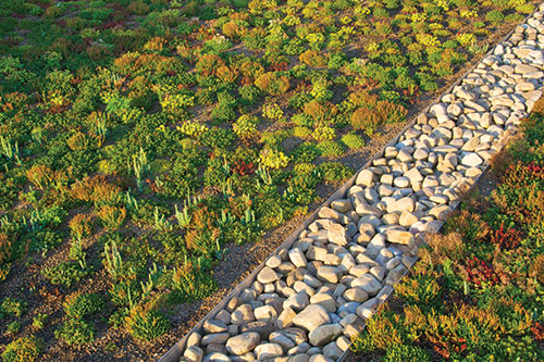 This project had many unusual challenges that were overcome by critical thinking and the use of creative materials. The main, overlapping challenge was the height of the project, which was seven floors up. Trees, rock, soil and plant material all had to go up. A 100-ton crane was used to lift the 12 Autumn Brilliance Serviceberry Redbuds and the 75-ton load of Tennessee River Slick rock. 1,000 yards of soil were installed by the use of a 90-foot vertical and 200-foot horizontal vacuum. The project team carried the plant material up the seven flights of stairs. Street space was needed when using the crane and vacuum. Logistical planning was required to get permission to close the road. Once approved, the road was closed for one week from 8 a.m. to 3:30 p.m. All trees, soil and rock had to be installed during that tight timeframe. Other challenges included securing the specified sedum. Many of the varieties shown in the original design were not appropriate selections, so suggestions were made for more sustainable and suitable varieties. Also, all the sedum was specially grown for the project.