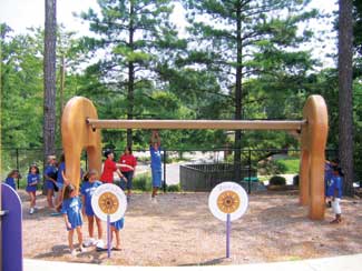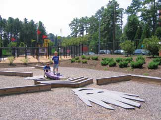 The play pieces throughout the park were the creation of Filament Studios in Boston, Mass. and were turned into reality by Design Dimensions of Raleigh. Working in collaboration with OBS, Filament created the pieces using a combination of parts found in playground equipment catalogues and specially-fabricated forms and elements.