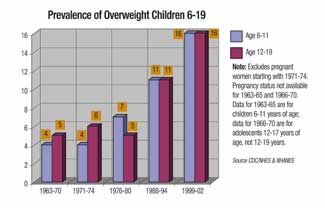 Results from the 1999-2002 National Health and Nutrition Examination Survey (NHANES) indicate that an estimated 16 percent of children and adolescents ages 6-19 years are overweight. As shown here, this represents a 45 percent increase from the overweight estimates of 11 percent obtained in 1988-94. The federal government?EUR??,,????'???s Center for Disease Control offers a web page with design resources, ?EUR??,,????'??Designing & Building Healthy Places.?EUR??,,????'?? The address is www.cdc.gov/healthyplaces/