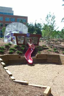 In addition, the playground was designed to be accessible to children with disabilities. The entrance to the playground is connected to the building?EUR??,,????'???s entrance through the use of a serpentine modular retaining wall that leads children from one feature to another. As the children move to and from the park they are guided by the wall.