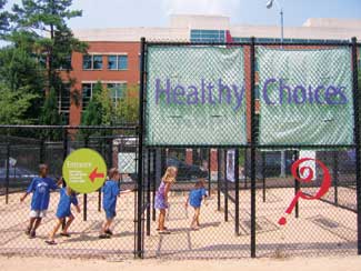 By making the correct choices on a variety of health issues children will make it through the Healthy Choices Maze, and are rewarded with access to raised platforms which allow views across the park. The maze is created out of chain link fence with signage asking children to make a choice and decide their direction. Whether to eat a banana or a donut for breakfast or whether or not to wear a bike helmet are choices we make everyday and the children need to make the right ones to get through the maze.