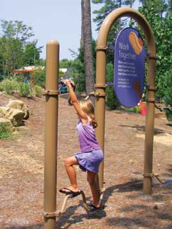 Children also balance on a 60-foot-long skeleton created out of balance beams or travel a zip line on a play exhibit with the playful name In One Ear and Out the Other. The whimsical Sun Shelter Cap angling out of the ground with nearby sunglasses provides escape from the afternoon sun and hard-to-miss message about sun protection.