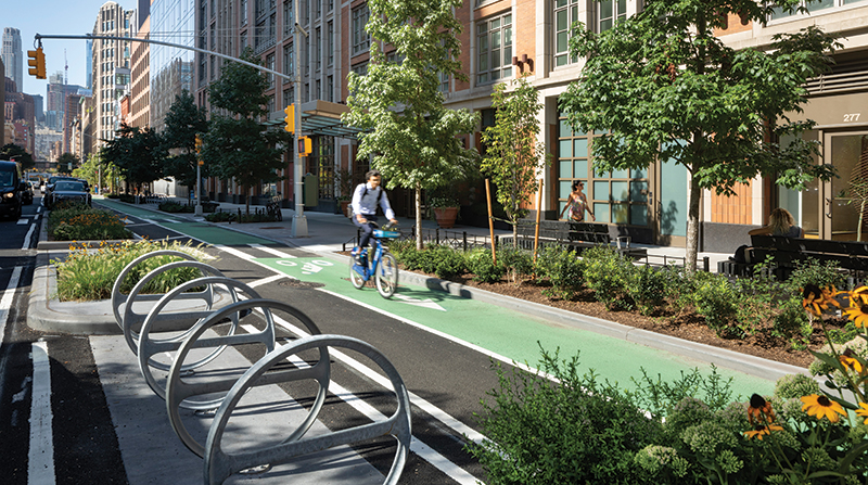 In 2022, Hudson Street was unveiled as a newly transformed corridor - a pedestrian-focused, green boulevard that reflects the creative energy of Manhattan's Hudson Square neighborhood. A partnership between the Hudson Square Business Improvement District (BID), New York City Economic Development Corporation (NYCEDC), New York City Department of Transportation (NYC DOT), and NYC-based landscape architecture firm Mathews Nielsen Landscape Architects (MNLA), the project is a cornerstone of the BID's first 10-year master plan. It represents a major milestone in the evolution of Hudson Square from a car-congested area near the Holland Tunnel into a vibrant, welcoming destination for workers, residents, and visitors alike.Location and HistoryLocated in Lower Manhattan between Canal and West Houston Streets, Hudson Street has long served as a critical connector. Yet, its identity was historically defined by vehicle congestion and infrastructure geared more toward traffic than place. As part of a broader neighborhood vision spearheaded by the Hudson Square BID, the reconstruction of Hudson Street was identified early on as a key opportunity to reallocate space for pedestrians, introduce green infrastructure, and foster a sense of place. Project GoalsThe reconstruction aimed to address four interconnected goals. The first was to enhance multi-modal mobility and pedestrian safety. The second was closely related in its intent to unlock public space for everyday use and enjoyment. A third goal involved improving environmental performance and long-term sustainability, and the fourth goal was to support local business vitality through infrastructure improvements. The resulting streetscape is a balanced and flexible public realm that prioritizes access, safety, and neighborhood identity.