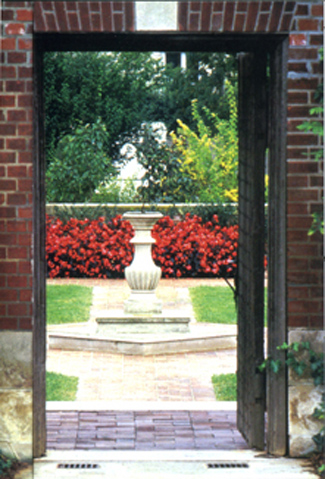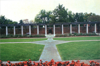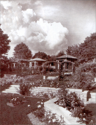 South of the formal walled garden, a rose garden had been established some time after Olmsted?EUR??,,????'???s plan was constructed. New wooden and woven wire trellises were designed for the renovation but have not as yet been installed. A secluded meditation area near the rear of the rose garden and accessible from the walled garden was developed in conjunction with the new design. Simple wooden benches surround a contemporary inspirational sculpture here.