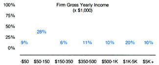 The following chart graphs the size of the firms responding in terms of gross yearly income. The numbers are impressive. Though the average firm size is 11, 57 percent of the respondents stated that their firm grosses more than $350,000 a year. This figure does not include state or local government, or public agencies. Approximately 20 percent of those responding work for public agencies.