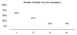 The chart shows a majority of you are licensed in one state only, but the percentage indicating licensing in more than one state has increased from 42 percent to 48 percent. Over 70 percent indicated that all their work comes from within their own state, while those reporting work coming from out of state has increased from 9 percent last year to 14 percent this year.